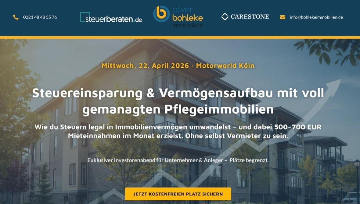 Einladung zur Informationsveranstaltung: Pflegeimmobilien als Kapitalanlage am Mittwoch den, 22.04.2026 in der MOTORWORLD Köln